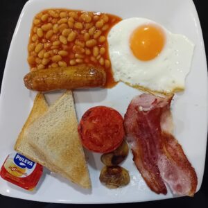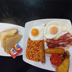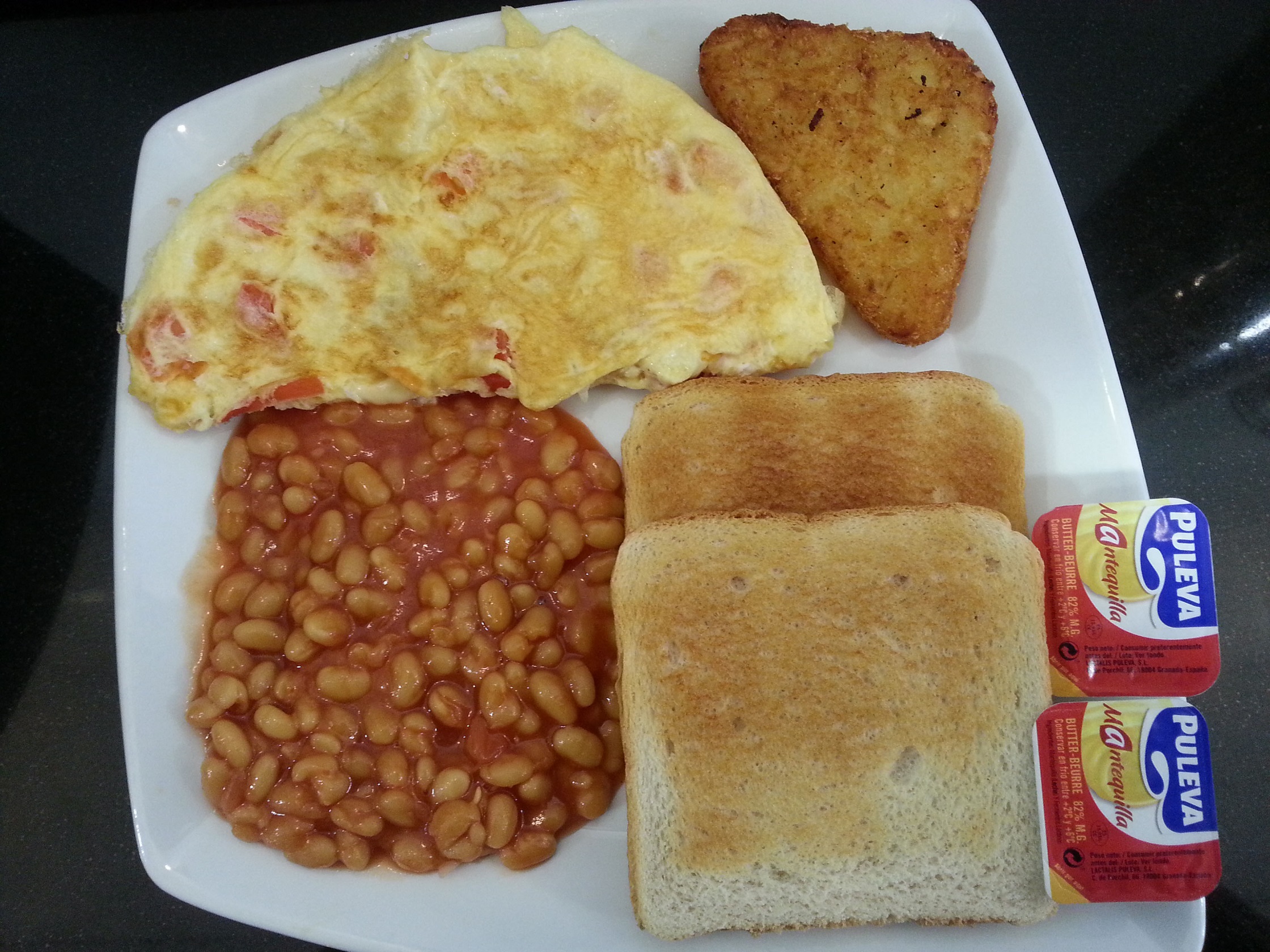 Omelett mit Käse, Tomate, Champignons und Zwiebeln, weiße Bohnen, 1 Hashbrown, 2 Toastbrot mit Butter